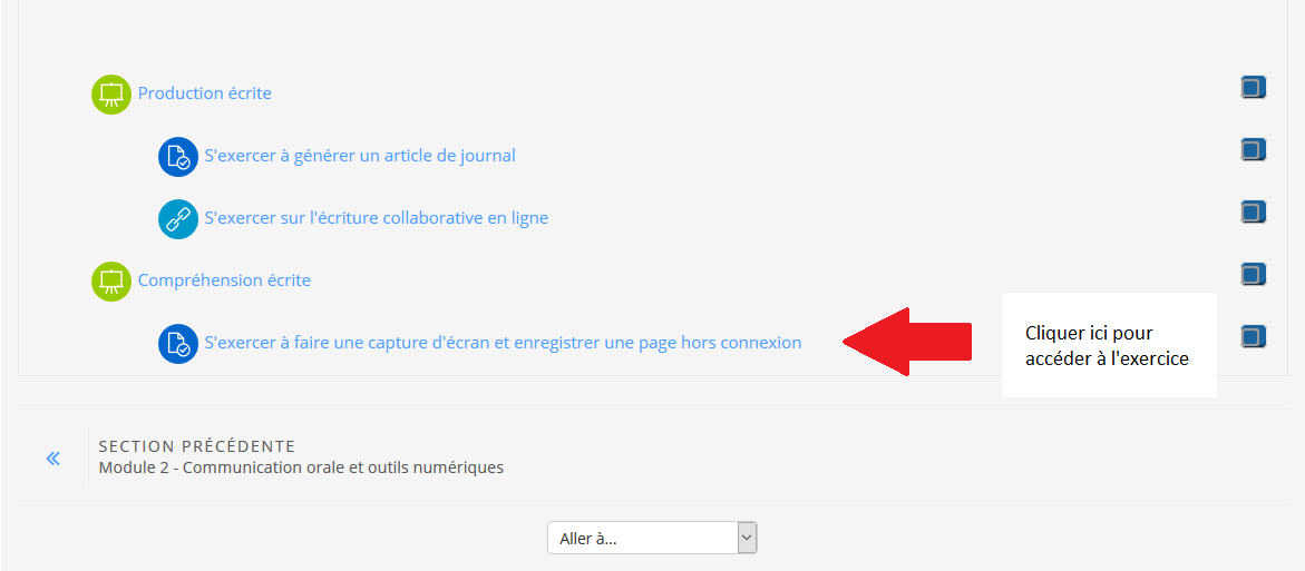 Rendez-vous sur la page d'accueil du module 3 dans "S'exercer à faire une capture d'écran et enregistrer une page hors connexion" pour accéder à l'activité proposée. Il s'agira de déposer une capture d'écran et une page web enregistrée et utilisable hors connexion.